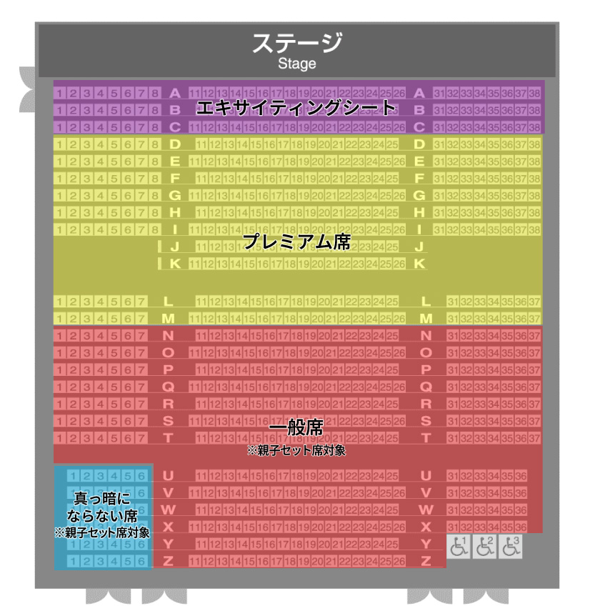 These seats maintain brightness even during performances. Please use this option if you are a first-time child or if you are concerned about darkness. Seats are in rows U to Z and numbers 1 to 6 (see the seat map here).