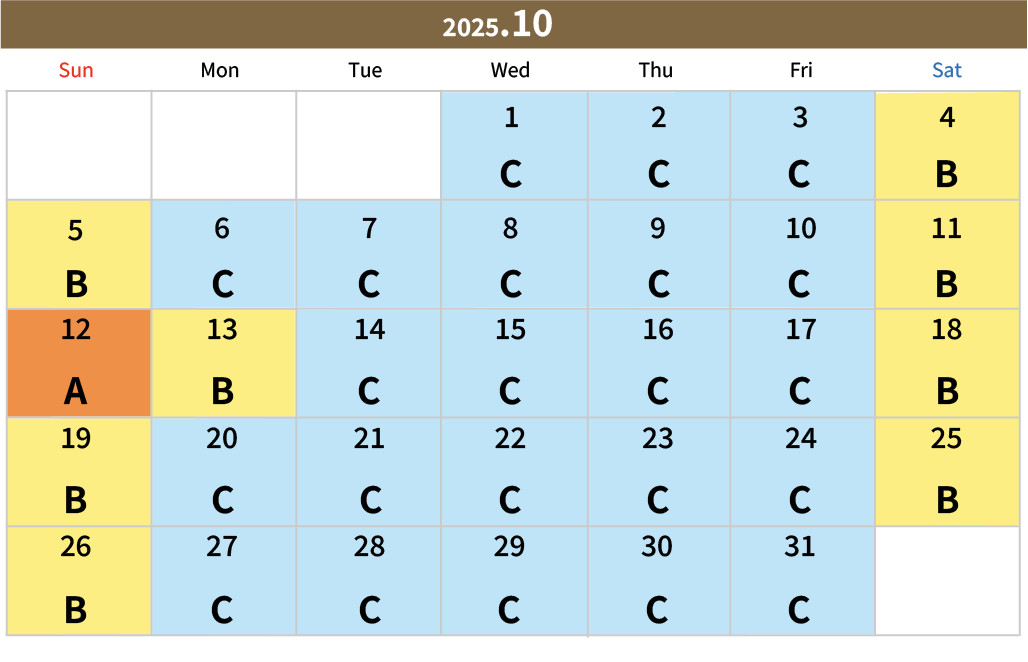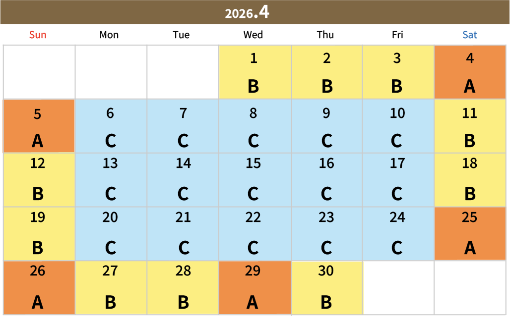 Please check the calendar below for the date of your visit (A, B, C, or D), then check the price list below the calendar.